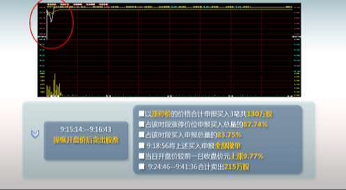 以 2015 年 3 月 23 日為例,相關賬戶利用資金優(yōu)勢,制造出股價開盤上漲的走勢,吸引其他投資者跟風買入,該股開盤后不久直接封上漲停板,違法主體卻悉數賣出了全部所持股票,瀟灑獲利離場。該日的股價走勢和操縱情況見下圖: