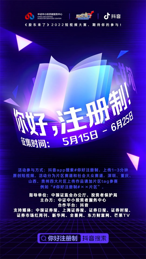 為進(jìn)一步貫徹落實(shí)中國證監(jiān)會(huì)黨委關(guān)于資本市場人民性的要求和保護(hù)投資者合法權(quán)益的職責(zé),在證監(jiān)會(huì)辦公廳、投資者保護(hù)局的指導(dǎo)下,中證中小投資者服務(wù)中心將于今年5月至9月舉辦《股東來了》2022投資者權(quán)益知識(shí)競賽活動(dòng)。