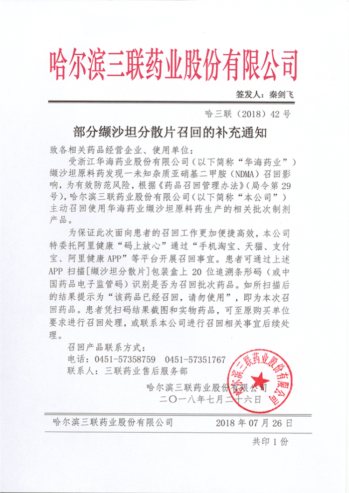 企業(yè)動態(tài) 企業(yè)動態(tài) 行業(yè)動態(tài)新聞中心企業(yè)動態(tài)部分纈沙坦分散片召回的補(bǔ)充通知發(fā)布日期:2018-07-27 點(diǎn)擊次數(shù): 次 注:電話咨詢時(shí)間為工作日8:30-11:30 ,13:30-17:00 上一篇文章下一篇文章