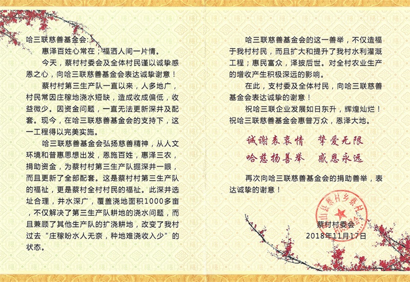 蔡村村民委員會感謝信