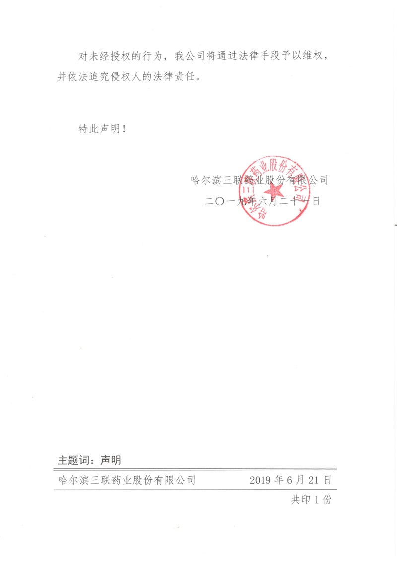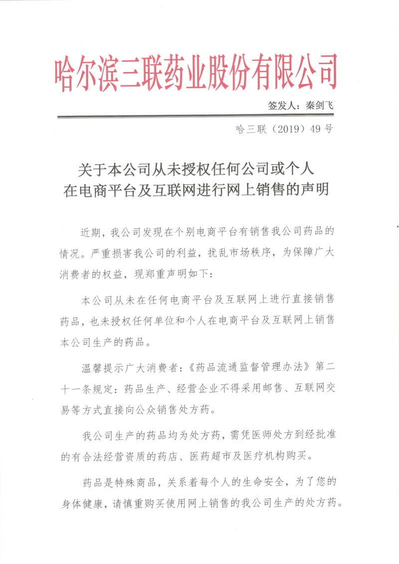 近期,我公司發(fā)現(xiàn)在個(gè)別電商平臺(tái)有銷售我公司藥品的情況。嚴(yán)重?fù)p害我公司的利益,擾亂市場秩序,為保障廣大消費(fèi)者的權(quán)益,現(xiàn)鄭重聲明: