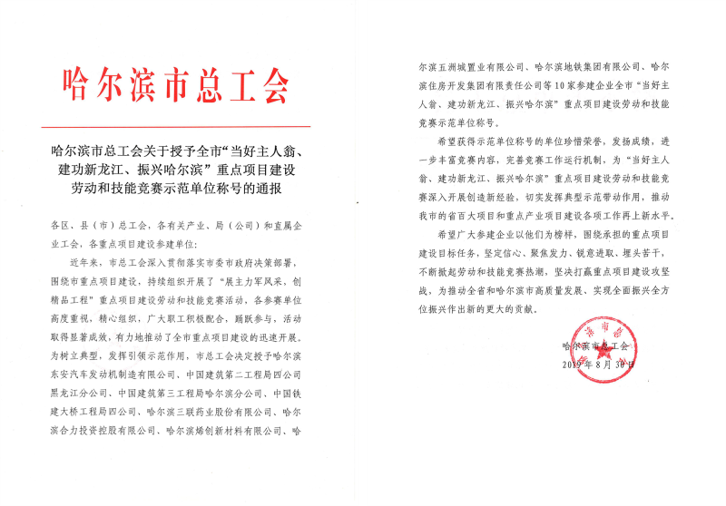 我公司榮獲“當(dāng)好主人翁、建功新龍江、振興哈爾濱”重點(diǎn)項(xiàng)目建設(shè)勞動(dòng)和技能競賽示范單位稱號(hào)