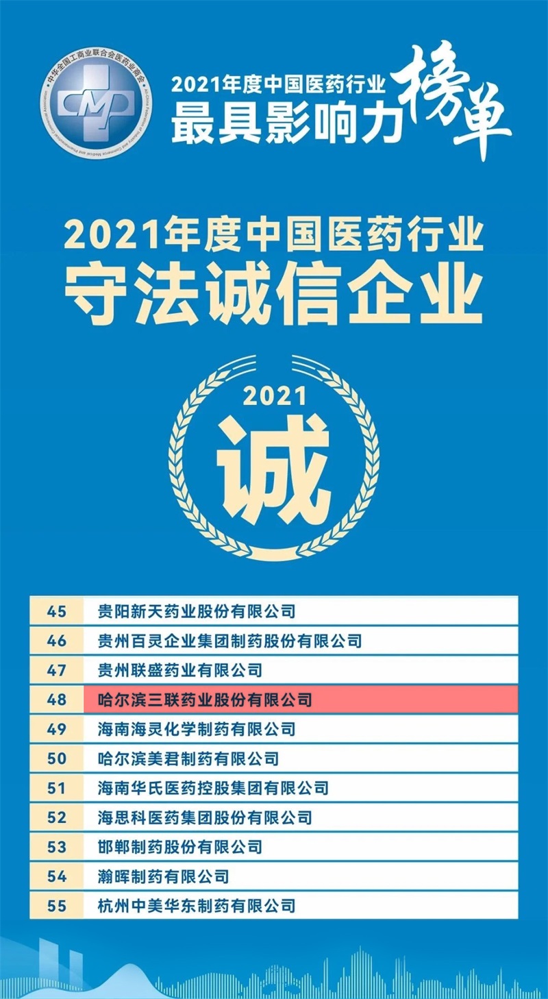 哈三聯(lián)喜獲2021年度中國醫(yī)藥行業(yè)守法誠信企業(yè)