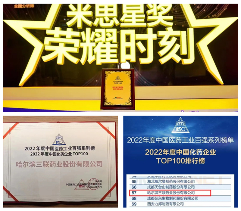 米內(nèi)網(wǎng)組織了中國(guó)醫(yī)藥工業(yè)百?gòu)?qiáng)排行榜專(zhuān)家委員會(huì),依托米內(nèi)網(wǎng)在中國(guó)獨(dú)家開(kāi)發(fā)運(yùn)行多年的三大終端六大市場(chǎng)終端格局?jǐn)?shù)據(jù)庫(kù),針對(duì)醫(yī)藥工業(yè)企業(yè),從兩大最重要的維度(創(chuàng)新驅(qū)動(dòng)力和專(zhuān)業(yè)推廣力)出發(fā),評(píng)選出了“2022年度中國(guó)醫(yī)藥工業(yè)百?gòu)?qiáng)系列榜單”。大會(huì)期間,多個(gè)權(quán)威榜單揭曉,哈三聯(lián)憑借扎實(shí)的研發(fā)生產(chǎn)實(shí)力和穩(wěn)健的市場(chǎng)推廣能力,成功入選“2022年度中國(guó)醫(yī)藥工業(yè)百?gòu)?qiáng)系列榜單”子榜單“2022年度中國(guó)化藥企業(yè)TOP100排行榜”,位列第67位。