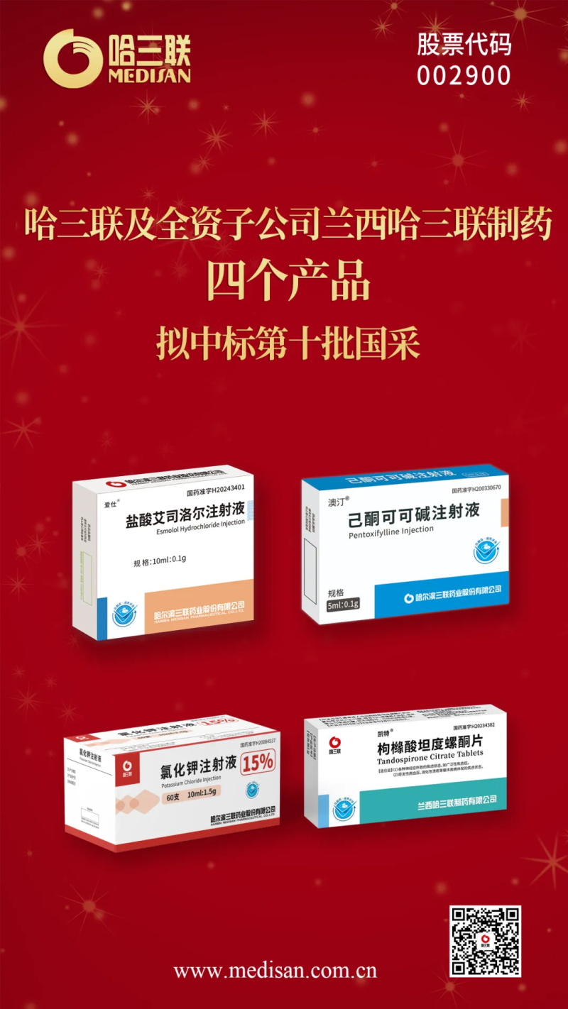 12月12日,第十批國(guó)家組織藥品集中帶量采購(gòu)產(chǎn)生擬中選結(jié)果,234家企業(yè)385個(gè)產(chǎn)品獲得擬中選資格,涉及62個(gè)品種,哈三聯(lián)鹽酸艾司洛爾注射液、已酮可可堿注射液、氯化鉀注射液及全資子公司蘭西哈三聯(lián)制藥的枸櫞酸坦度螺酮片擬中標(biāo)本次集中采購(gòu),其中鹽酸艾司洛爾注射液、枸櫞酸坦度螺酮片擬第一順位中選。